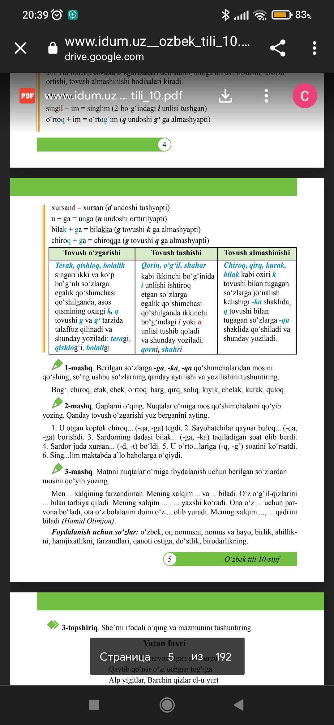 1. chiroqqa, 2. buloqqa, 3. bilakka, 4. xursand, 5. õrtoq, 6. Singlim