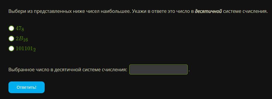 Выбери из представленных ниже чисел наибольшее. Укажи в ответе это число в десятичной системе счисления.