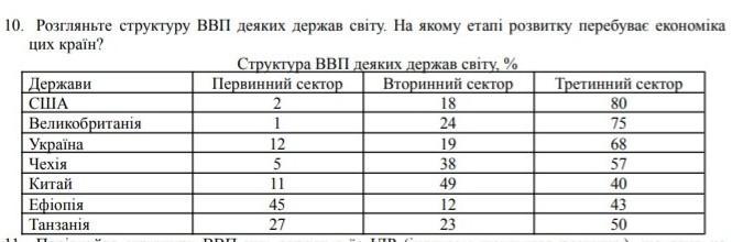 розгляньте структуру ВВП деяких держав світу.На якому етапі розвитку перебуває економіка цих країн?