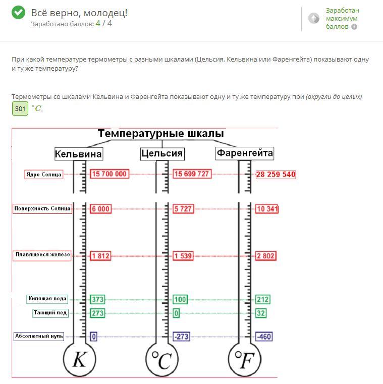 зная формулы перевода, связывающие различные температурные шкалы (скрин 2) и то, что термометры со шкалами Фаренгейта и Кельвина показывают одну и ту же температуру, обозначим искомую температуру в градусах Цельсия за x и решим уравнение: