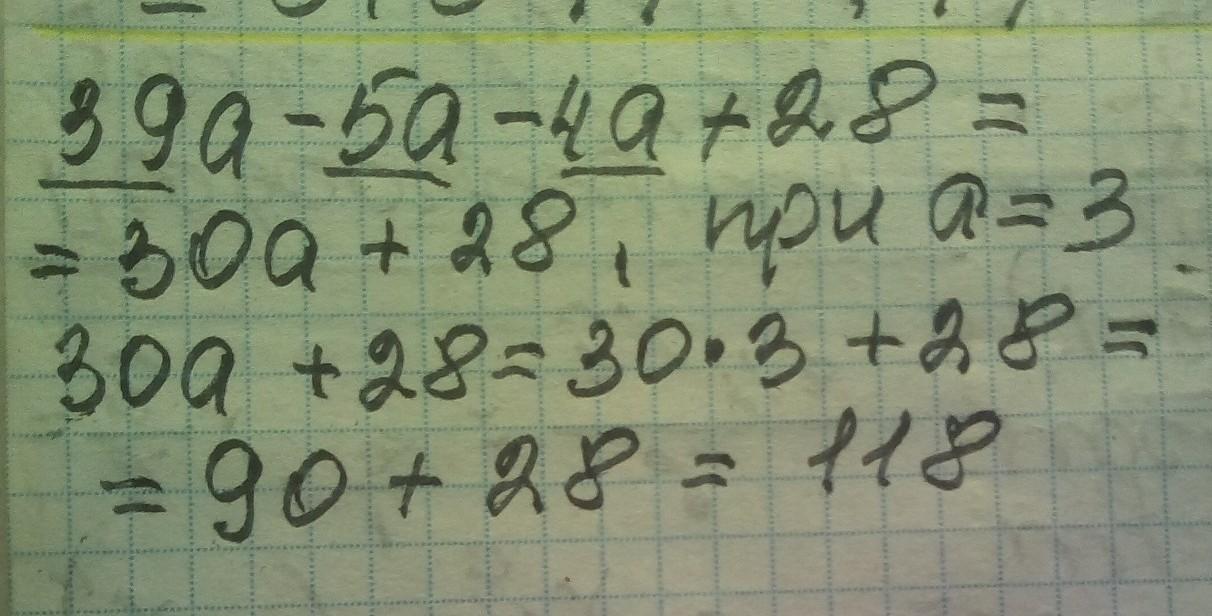 39а-5а-4а+28 при а=3 Должно получиться 118 Образец:5х + 7х при х = 16 5х+7х=х*(5+7)=х*12=12х При х=16 12х=12*16=192