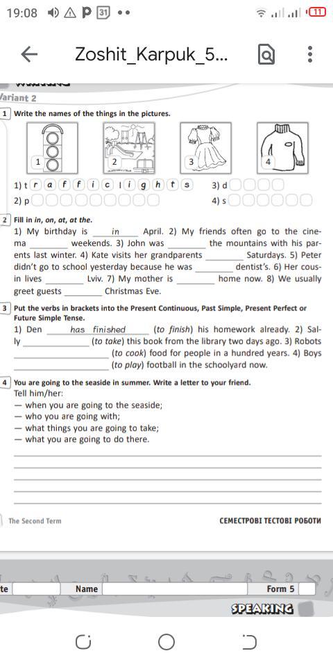Hello, (ім'я подруги), I'm going to the seaside in this summer, in July. I'm going with my family (якщо є, можеш написати: and my pet). I'm taking my clothes, sunglasses and book. I'm going swim in the sea, play beach volleyball and sunbathe and buy souveniers.