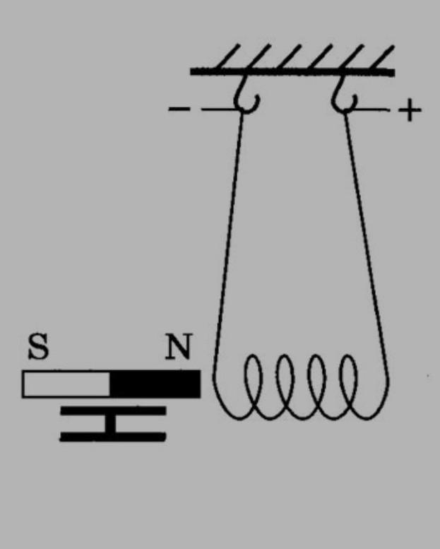 При указанной полярности источника питания катушка будет создавать магнитное поле, южный полюс которого расположен ближе к северному полюсу постоянного магнита. Поэтому катушка притягивается к магниту.