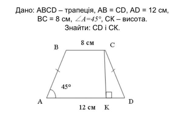 KD=(12-8)/2=4/2=2 см.Следовательно и СК=2 см. Тогда по т. Пифагора