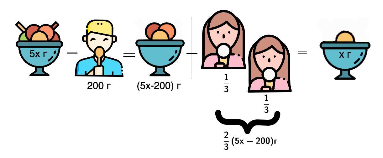Мама утром купила мороженое и положила его в холодильник. Вечером она обнаружила что количество мороженого уменьшилось в 5 раз. Оказалось что сын съел 200 г мороженого, а каждая из двух ее дочерей съела по трети от оставшейся части мороженого . Найдите общее количество мороженого.