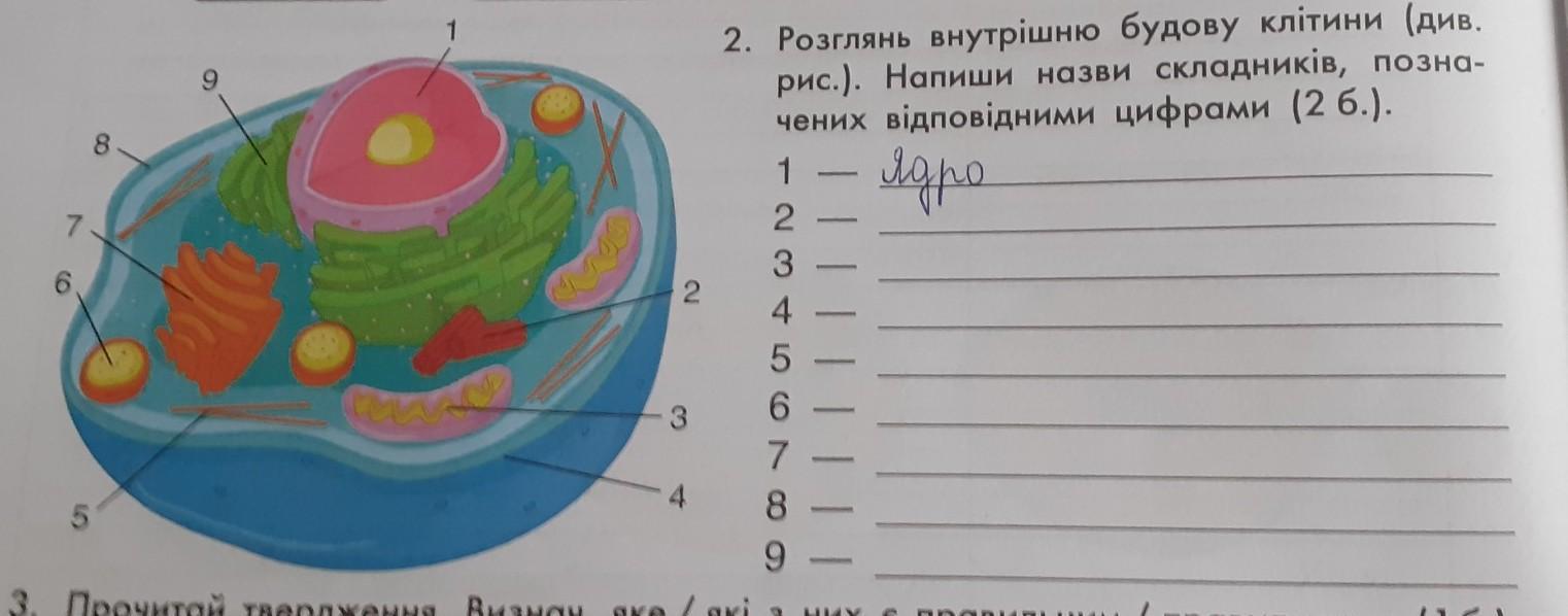 2. клітинний центр 3.мітохондрія 4.цитоплазма 5.рибосоми 6. лізосома. 7. апарат гольджі 8. мембрана 9.ендо плтзматична сітка