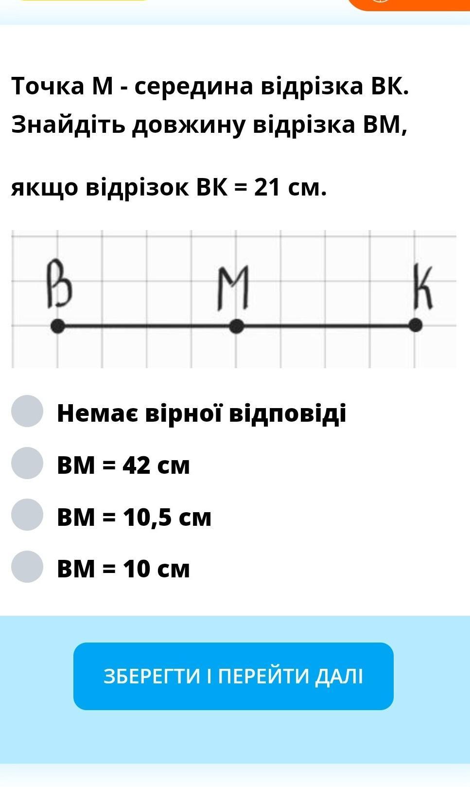 Точка М- середина відрізка ВК. Знайдіть довжину відрізка ВМ, якщо відрізок ВК = 21 см. B M Немає вірної відповіді BM = 42 CM BM = 10,5 см BM = 10 CM K