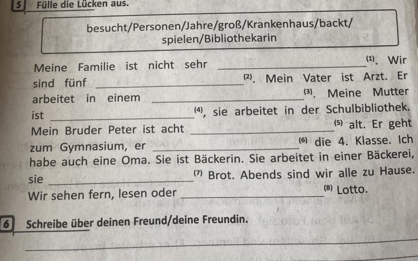 Пояснення: groß, Personen, Krankenhaus, Bibliothekarin, Jahre, besucht, backt, spielen