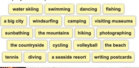 water skiing, swimming, dancing, fishing, windsurfing, visiting museums, sunbathing, hiking, photographing, cycling, volleyball, tennis, diving, writing postcards.