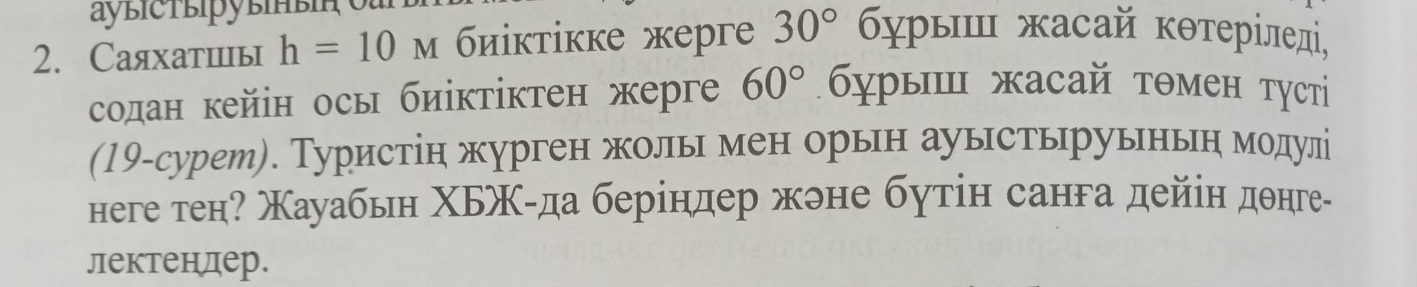путешественник поднимается на высоту h=10 м под углом 30° к земле, а затем спускается с этой высоты под углом 60° к земле. Чему равно расстояние, пройденное туристом, и модуль смещения? Дайте ответ в ХБЖ и округлите до целого числа.