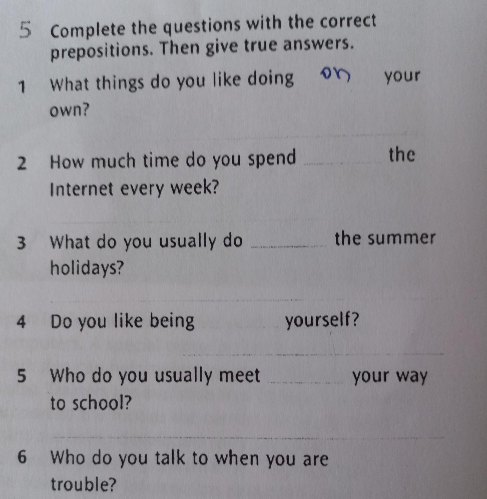 5 Complete the questions with the correct prepositions. Then give true answers.