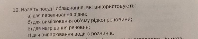 12. Назвіть посуд і обладнання, які використовують: а) для переливання рідин; б) для вимірювання об'єму рідкоï речовини; в) для нагрівання речовин; г) для випарювання води з розчинів.