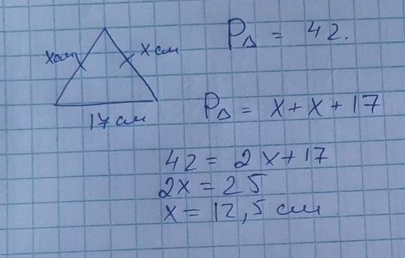 Периметр рівнобедреного трикутника дорівнюе 42 см, а основа - 17 см. Знайдіть бічну сторону цього трикутника