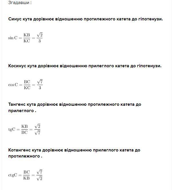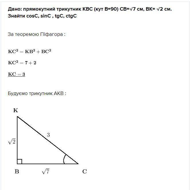 Дано: прямокутний трикутник KBC (кут B=90) CB=√7 см, BK= √2 см. Знайти cosC, sinC , tgC, ctgC