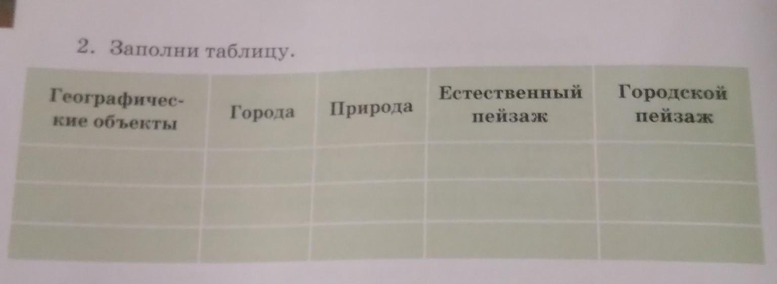 Гегорафические объекты- поверхность Земли, население, экономические ресурсы. Города- Москва, Питер, Алматы, Костанай. Естественный пейзаж- морской, речной. Городской пейзаж- изображение зданий, изображение мостовых и тротуаров, улиц.