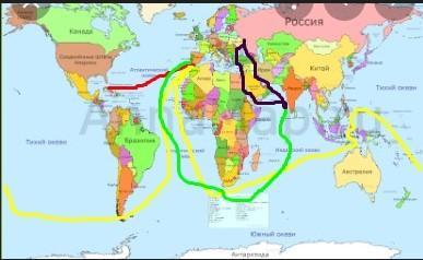 Красным обозначен путь Х.Колумба, фиолетовым - А.Никитина, зеленый - Васко да Гама, желтый - Ф.Магеллан