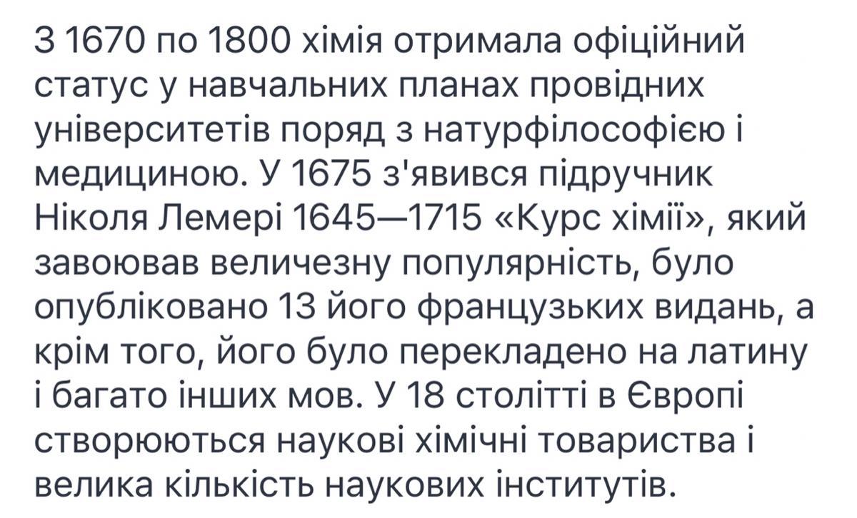 З 1670 по 1800 хімія отримала офіційний статус у навчальних планах провідних університетів поряд з натурфілософією і медициною. У 1675 з'явився підручник Ніколя Лемері 1645—1715 «Курс хімії», який завоював величезну популярність, було опубліковано 13 його французьких видань, а крім того, його було перекладено на латину і багато інших мов. У 18 столітті в Європі створюються наукові хімічні товариства і велика кількість наукових інститутів.