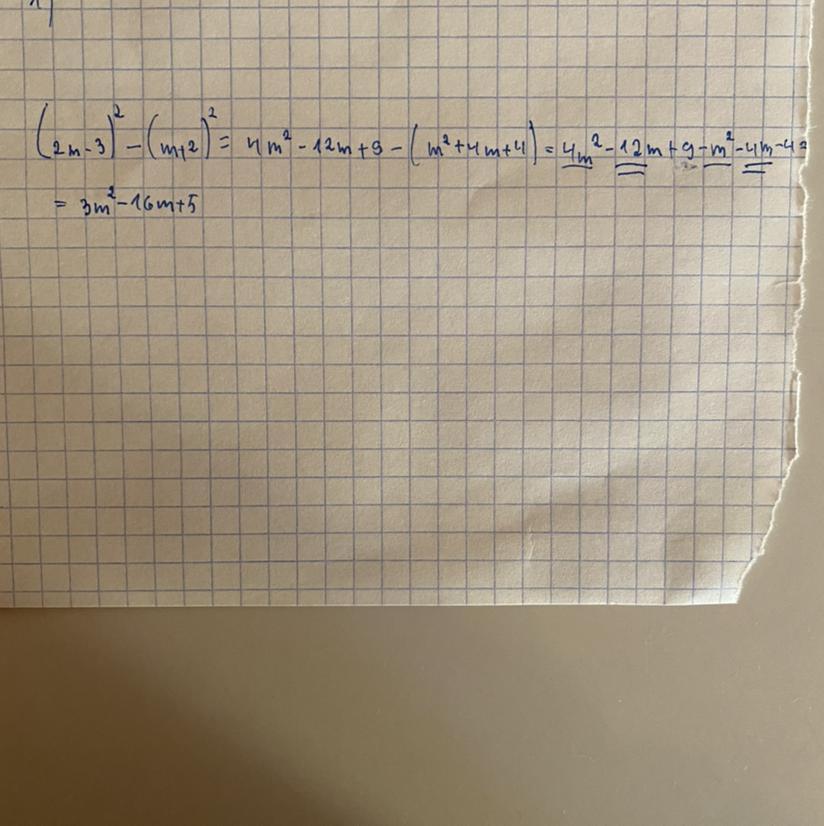(2m - 3)² - (m + 2)² = (2² · m² - 2 · 2m · 3 + 3²) - (m² + 2 · 2m + 2²) = (4m² - 12m + 9) - (m² + 4m + 4) = 4m² - 12m + 9 - m² - 4m - 4 = 3m² - 16m + 5