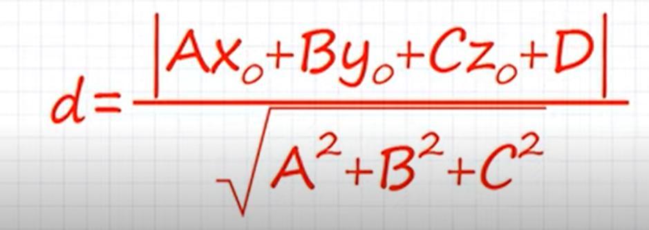 Расстояние d от плоскости Ax+By+Cz+D=0 до точки M₀(x₀; y₀; z₀) находится по формуле: