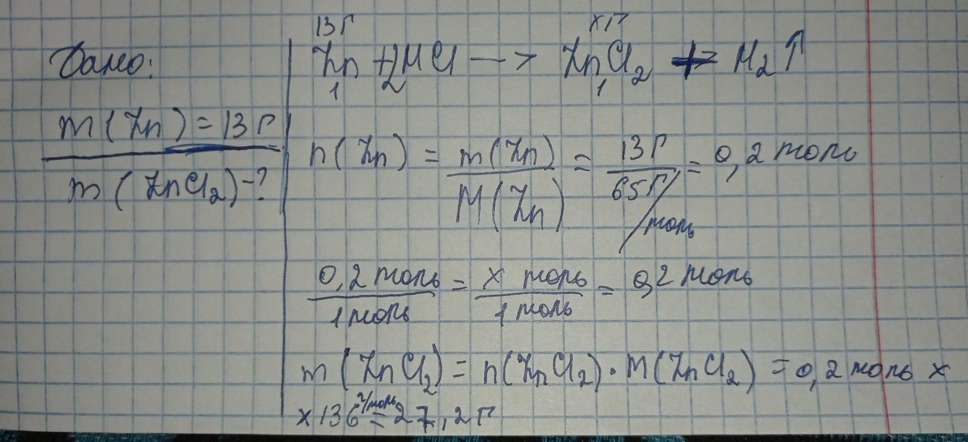 Откуда мы взяли 136 г/моль? Это относительная молярная масса ZnCl2 — 65+2•35,5 = 65+71=136.