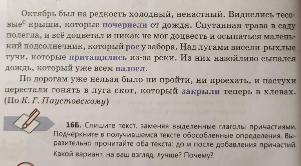 Октябрь был на редкость холодный, ненастный. Виднелись тесо- вые крыши, которые почернели от дождя. Спутанная трава в саду полегла, и всё доцветал и никак не мог доцвесть и осыпаться малень- кий подсолнечник, который рос у забора. Над лугами висели рыхлые тучи, которые притащились из-за реки. Из них назойливо сыпался дождь, который уже всем надоел. По дорогам уже нельзя было ни пройти, ни проехать, и пастухи перестали гонять в луга скот, который закрыли теперь в хлевах. (по К.Г. Паустовскому). 16Б. Спишите текст, заменяя выделенные глаголы причастия моти. Подчеркните в получившемся тексте обособленные определения. Вы- разительно прочитайте оба текста: до и после добавления причастий. Какой вариант, на ваш взгляд, лучше? Почему? 3
