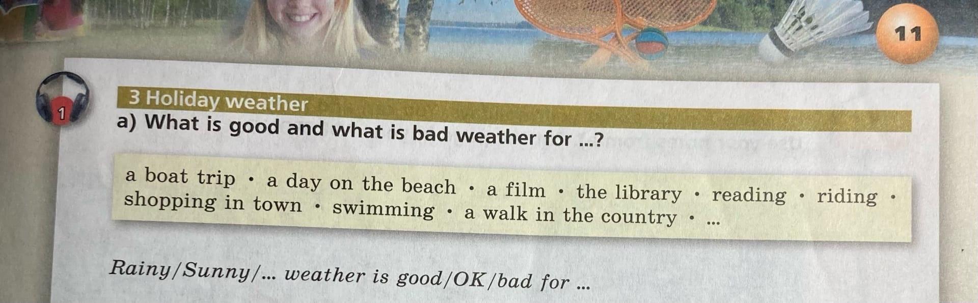 Sunny weather is good for a boat trip, a day on the beach, riding a bike, swimming, walking in the country, and for shopping.