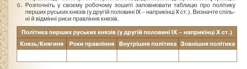 6. Розпочніть у своєму робочому зошиті заповнювати таблицю про політику перших руських князів (у другій половині IX - наприкінці Х ст.). Визначте спiльні й відмінні риси правління князів.