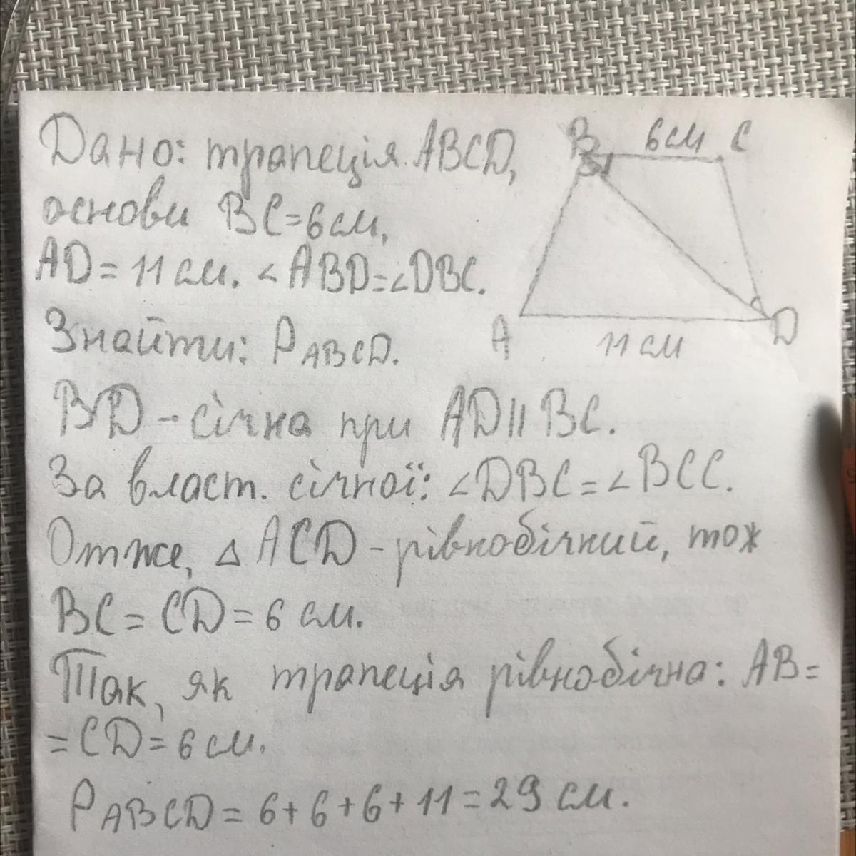 Відповідь: периметр трапеції 29 см.