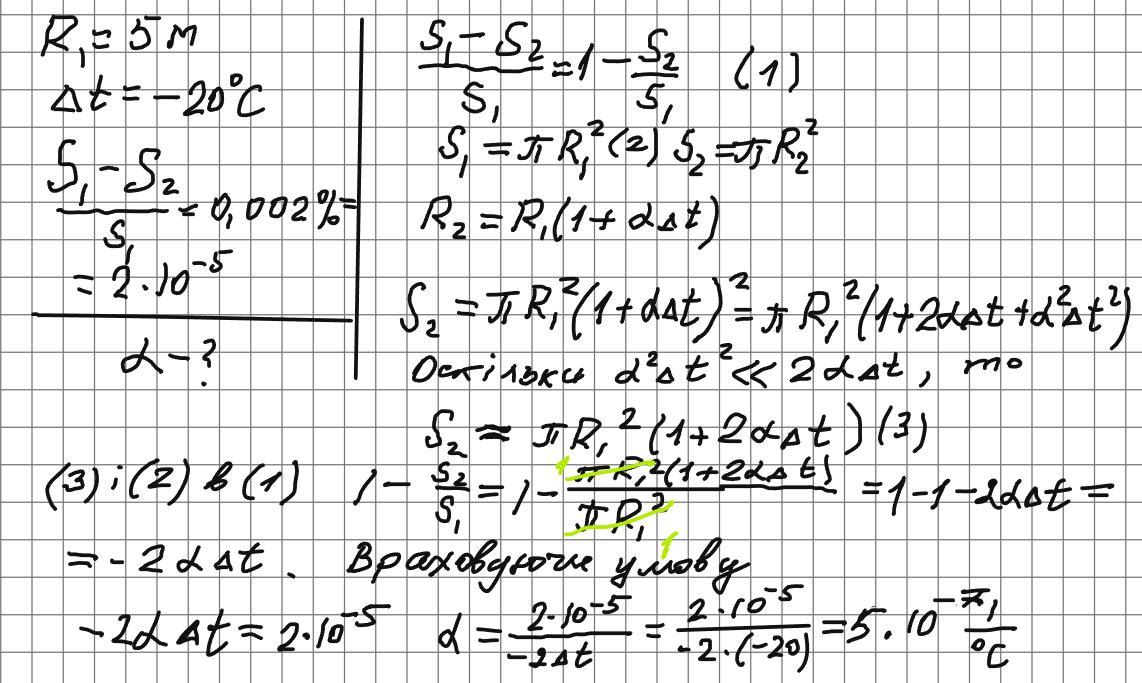 Диск радіусом 5 м при охолодженні на 20 градусів зменшив свою площу на 0.002%. Знайдіть коефіцієнт теплового розширення матеріалу диску.