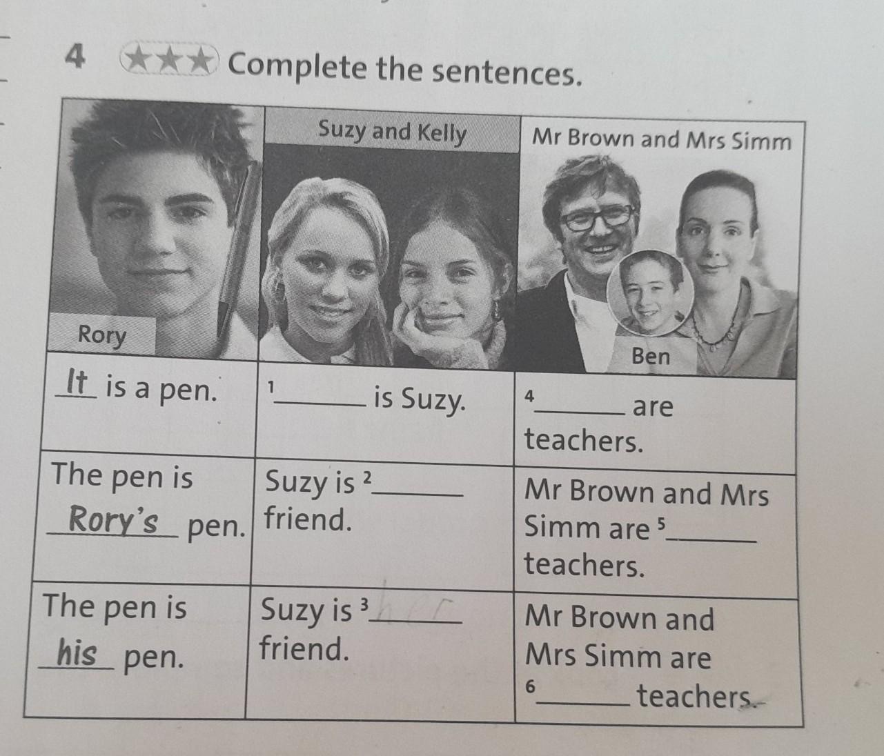 4 *** Complete the sentences. Suzy and Kelly Rory It is a pen. 1 The pen is his pen. is Suzy. The pen is Suzy is 2 Rory's pen. friend. Suzy is 3 friend. Mr Brown and Mrs Simm 4 Ben are teachers. Mr Brown and Mrs Simm are 5 teachers. Mr Brown and Mrs Simm are 6 teachers.