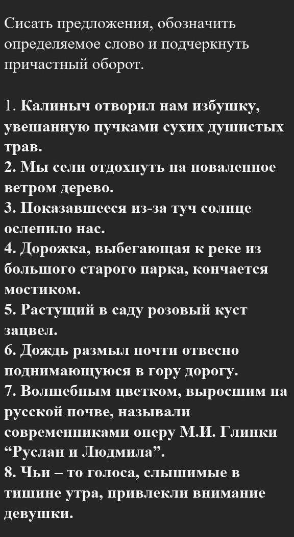 Ответ:Калиныч отворил нам (ос)избушку, /увешанную пучками сухих душистых трав./ 2. Мы сели отдохнуть /на поваленное ветром /(ос)дерево. 3./ Показавшееся из-за туч/солнце(ос) ослепило нас. 4. (ос) Дорожка, /выбегающая к реке из большого старого парка/, кончается мостиком. 5. /Растущий в саду розовый /куст(ос) зацвел. 6. Дождь размыл /почти отвесно поднимающуюся в гору/ дорогу(ос).7. Волшебным цветком(ос), /выросшим на русской почве/, называли современниками оперу М.И. Глинки “Руслан и Людмила”. 8. Чьи – то голоса(ос), /слышимые в тишине утра/, привлекли внимание девушки.