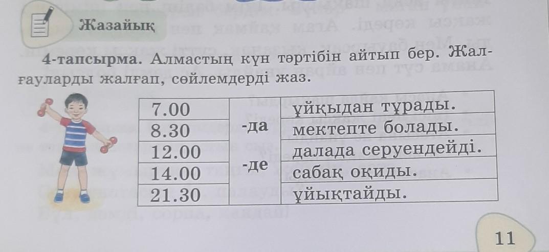 Жазайық 4-тапсырма. Алмастын күн тортiбiн айтып бер. Жал- тауларды жалгап, сойлемдердi жаз. 7.00 8.30 12.00 14.00 21.30 -да -де уйқыдан тұрады. мектепте болады. далада серуендейді. сабак окиды. уйыктайды.