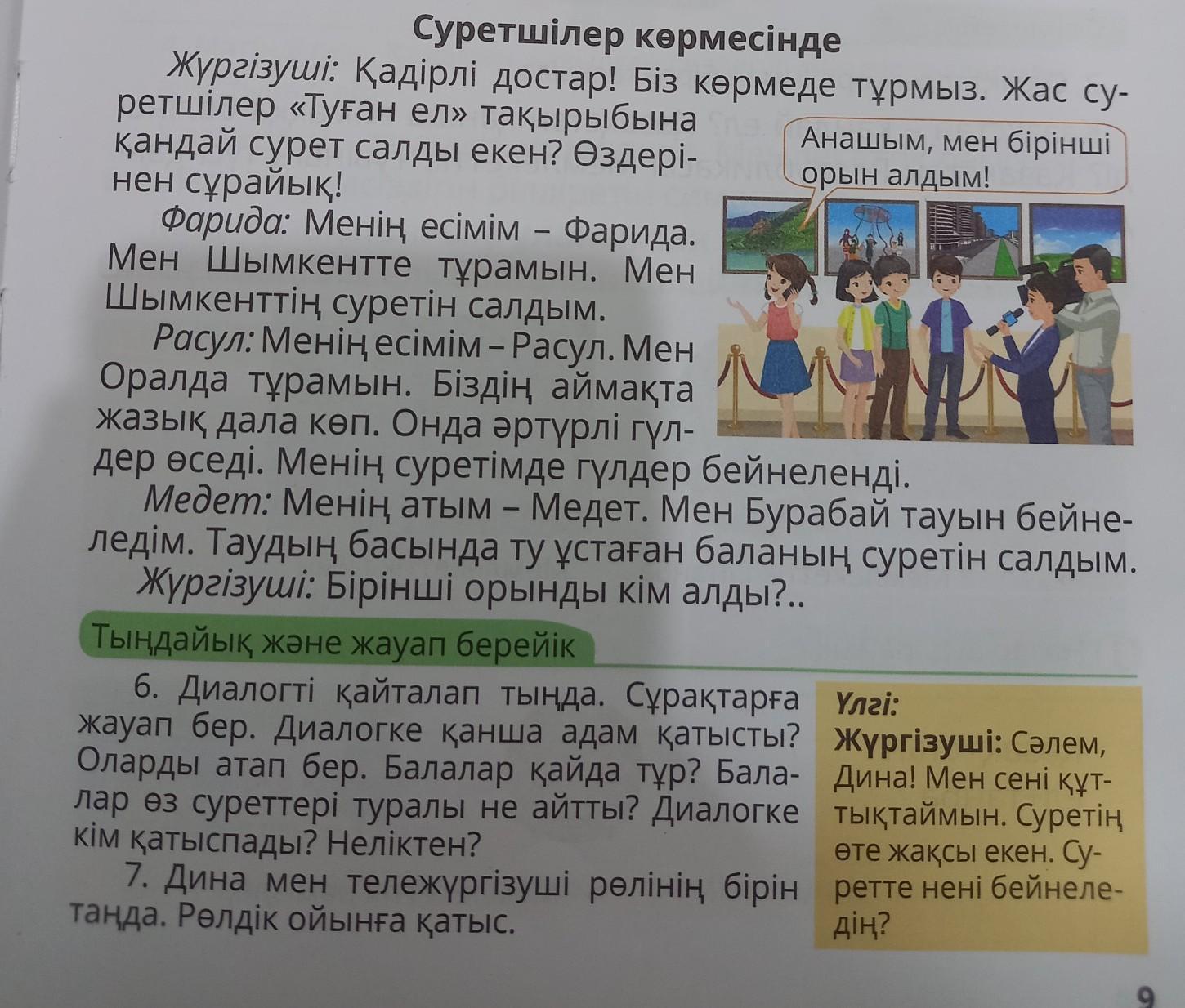 помогите ответить по текстуна вопросы.Диалогті қайталап тында.Сұрақтарға жауап бер.