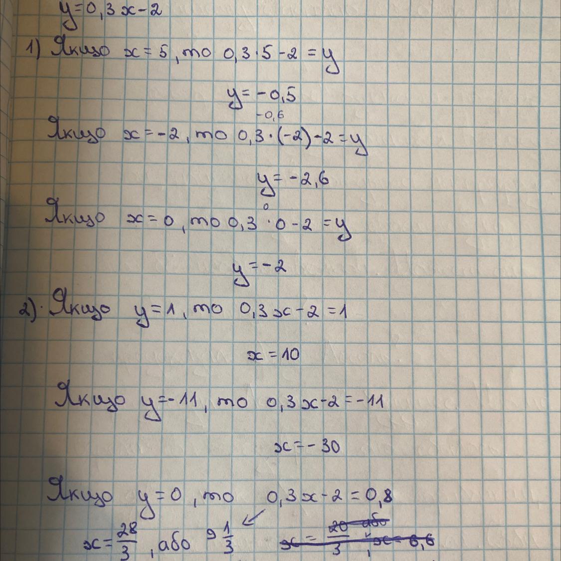 Функцію задано формулою y=0,3x-2 Знайдіть: 1) значення функції, якщо значення аргументу дорівнює: 5;-2;0;