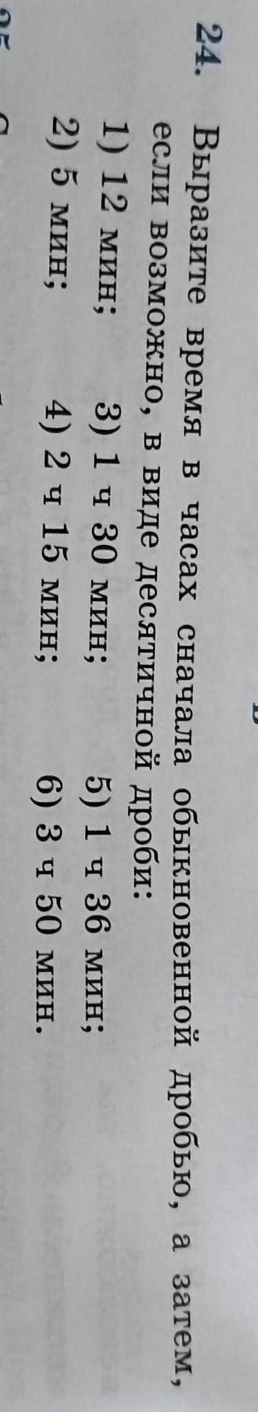 24. Выразите время в часах сначала обыкновенной дробью,а затем, если возможно, в виде десятичной дроби: 1) 12 мин; 5) 1 ч 36 мин; 6) 3 ч 50 мин. 2) 5 мин; 3) 1 ч 30 мин; 4) 2 ч 15 мин; ятичн