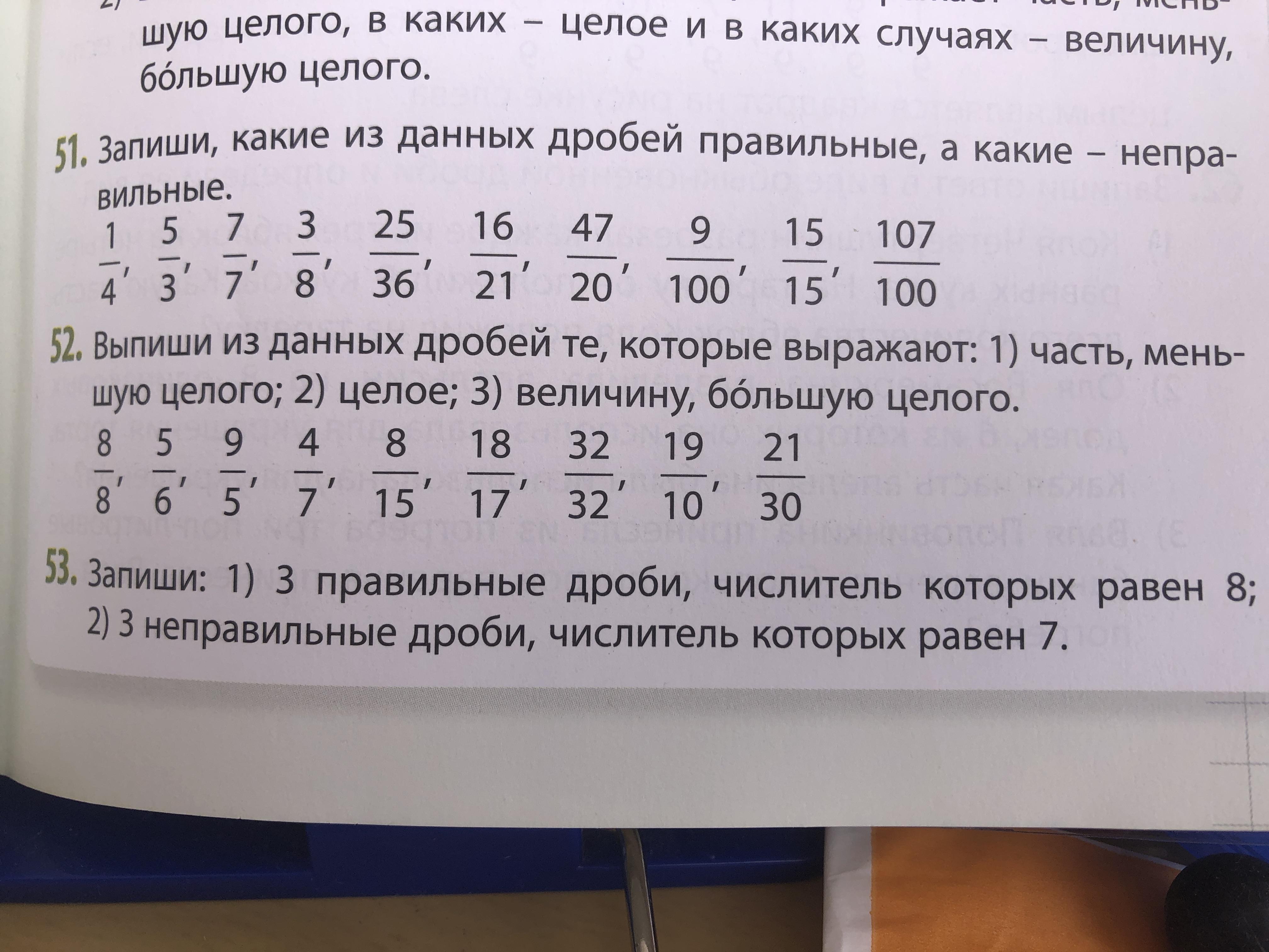 51. правильные: 1/4, 3/8, 25/36, 16/21, 9/100. Не правильные: 5/3, 7/7, 47/20, 15/15, 107/100. номер 52. 1) 5/6, 4/7, 8/15, 21/30. 2) 8/8, 32/32. 3) 9/5, 18/17, 19/10. номер 53. 1) 8/10, 8/12, 8/9. 2) 7/1, 7/5, 7/2