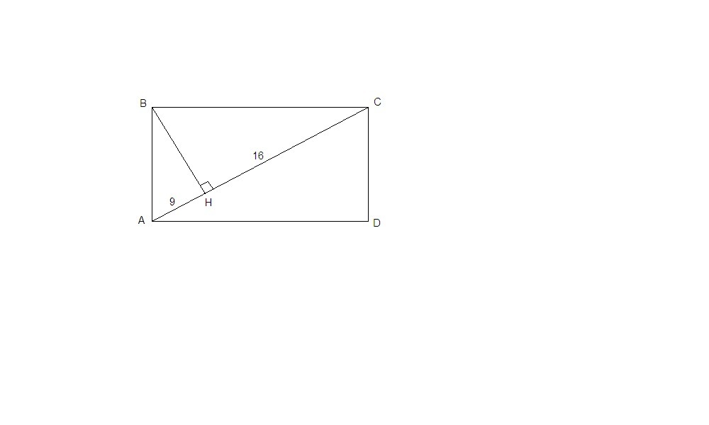 Из вершины прямоугольника на диагональ опущен перпендикуляр,который делит ее на отрезки длинной 9 см и 16 см. Найдите тангенс угла,образованного меньшей стороной и диагональю.