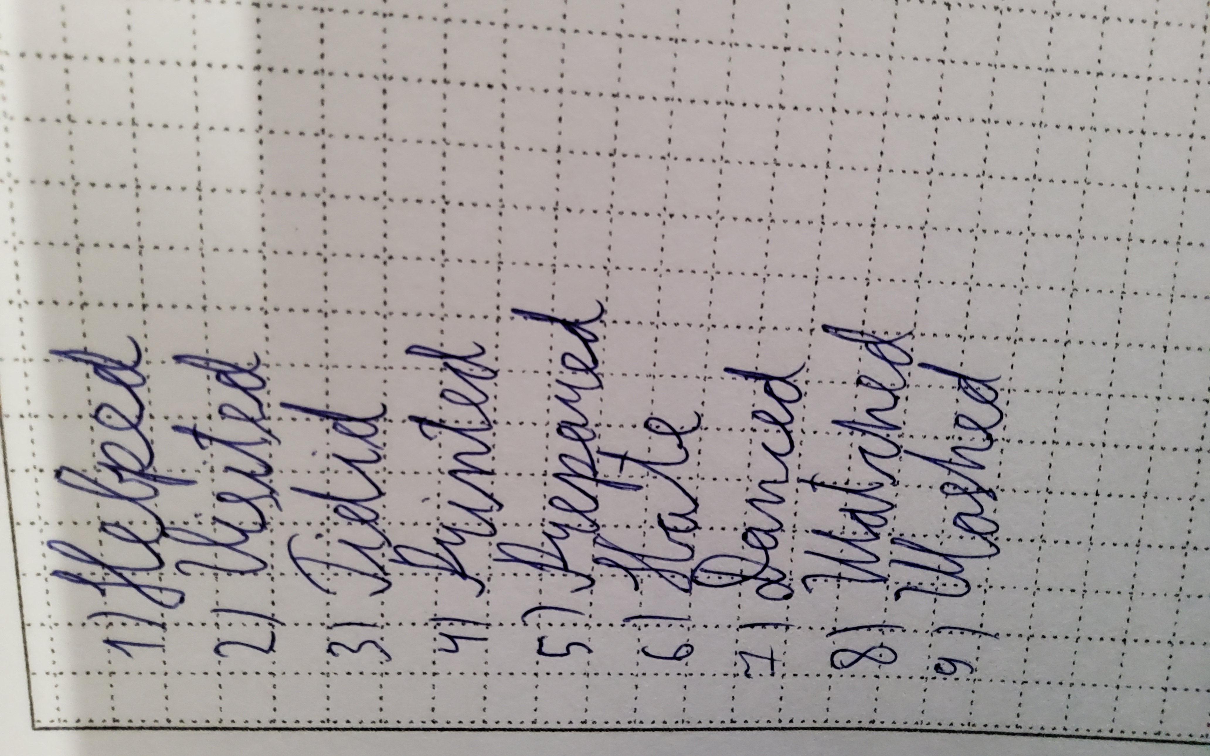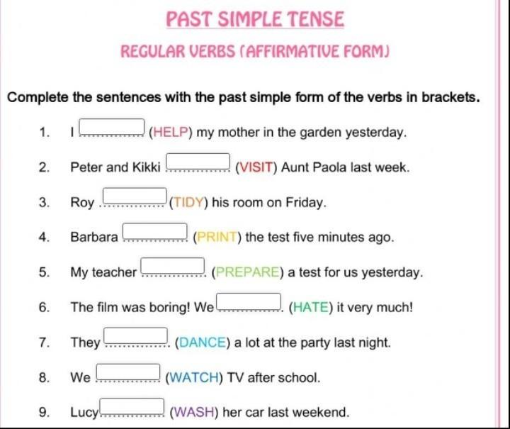 Объяснение:Helped,Visited,Tidied,Printed,Prepared,Hate,Danced,Watched,Washed
