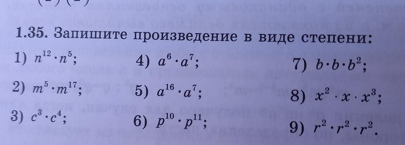 1.35. Запишите произведение в виде степени: 1) n12 . n5; 4) a.a'; 7) b.b-b²; 8) x²-x. x³; 9) p2.p2.p2 2) m³.m¹7; 3) c².c'; 5) als.a'; 6) p10. pl;