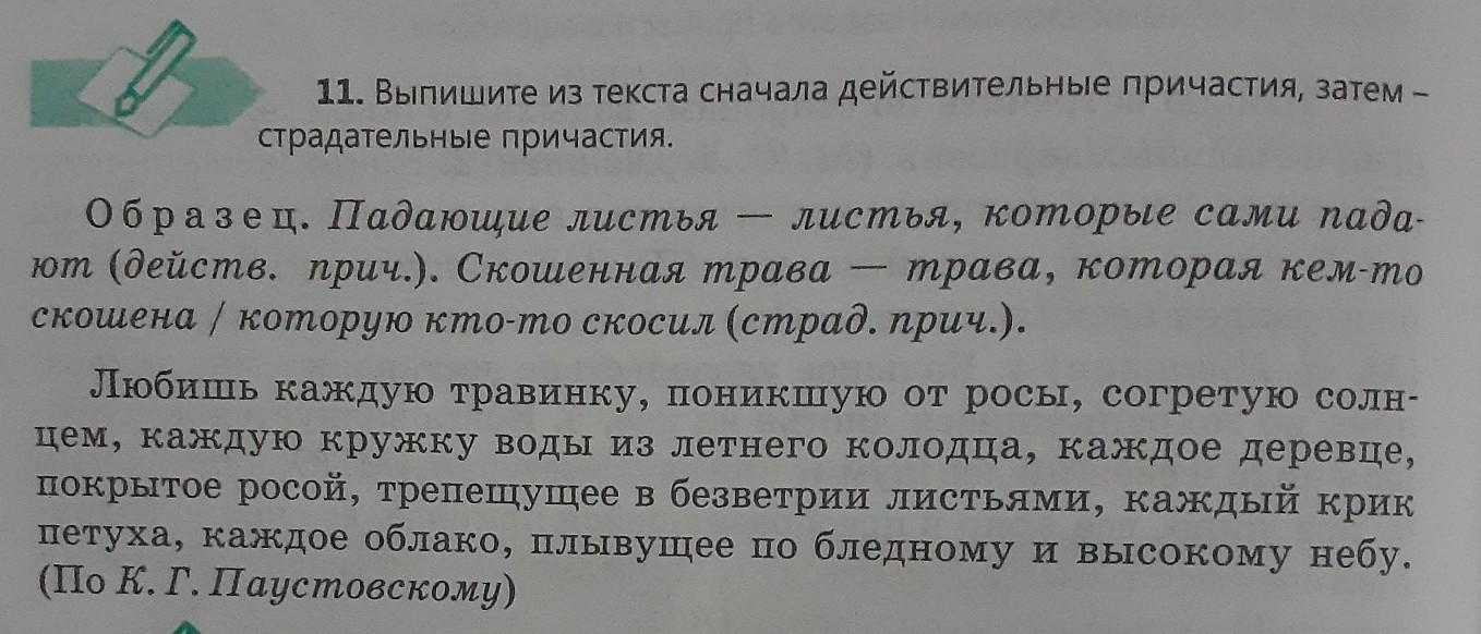 11. Ве на текста сначала действительные причастия, затем - страдательные причастия Образец. Падающие листья - листья, которые сами пада юм (действ. прич.). Скошенная трава скошена / моторую кто-то скосил (страд. прич.). трава, которая кем-то Se Любишь каждую травинку, поникшую от росы, согретую солн- цем, каждую кружку воды из летнего колодца, каждое дерекпе покрытое росой, трепещущее в безветрии листьями, каждый крик петуха, каждое облако, плывущее по бледному и высокому небу. (По К.Г. Паустовскому)
