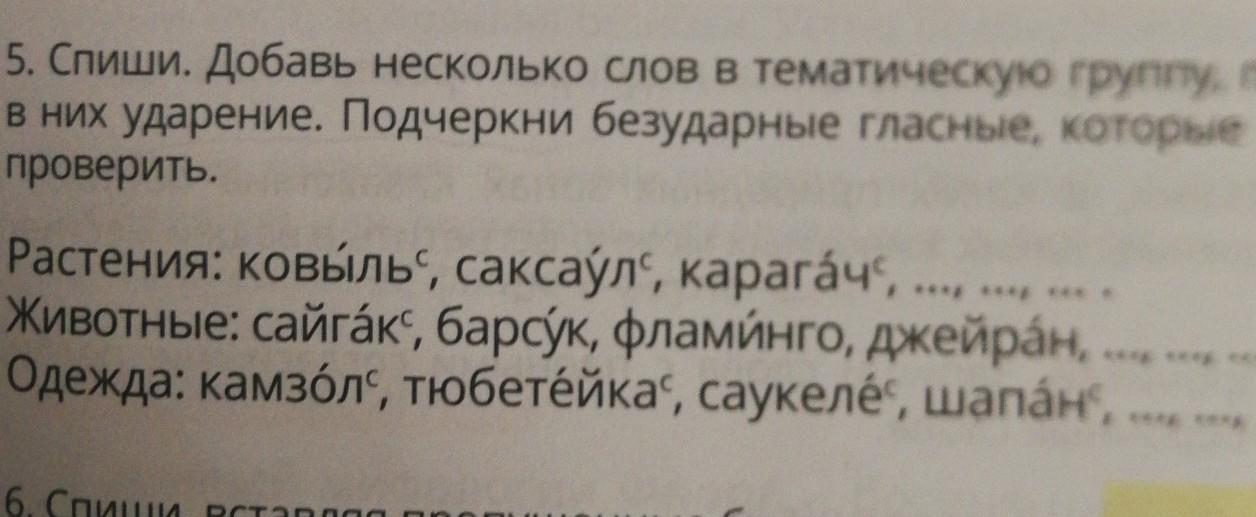5.Спиши. Добавь несколько слов в тематическую группу, поставь в них ударение. Подчеркни безударные гласные, которые нельзя проверить