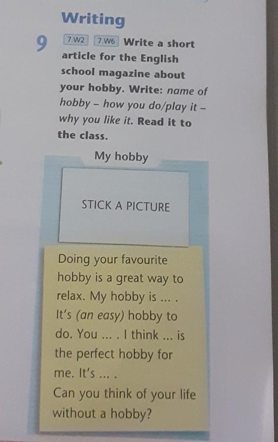 9 Writing 7.W2 7.W6 Write a short article for the English school magazine about your hobby. Write: name of hobby - how you do/play it - why you like it. Read it to the class.