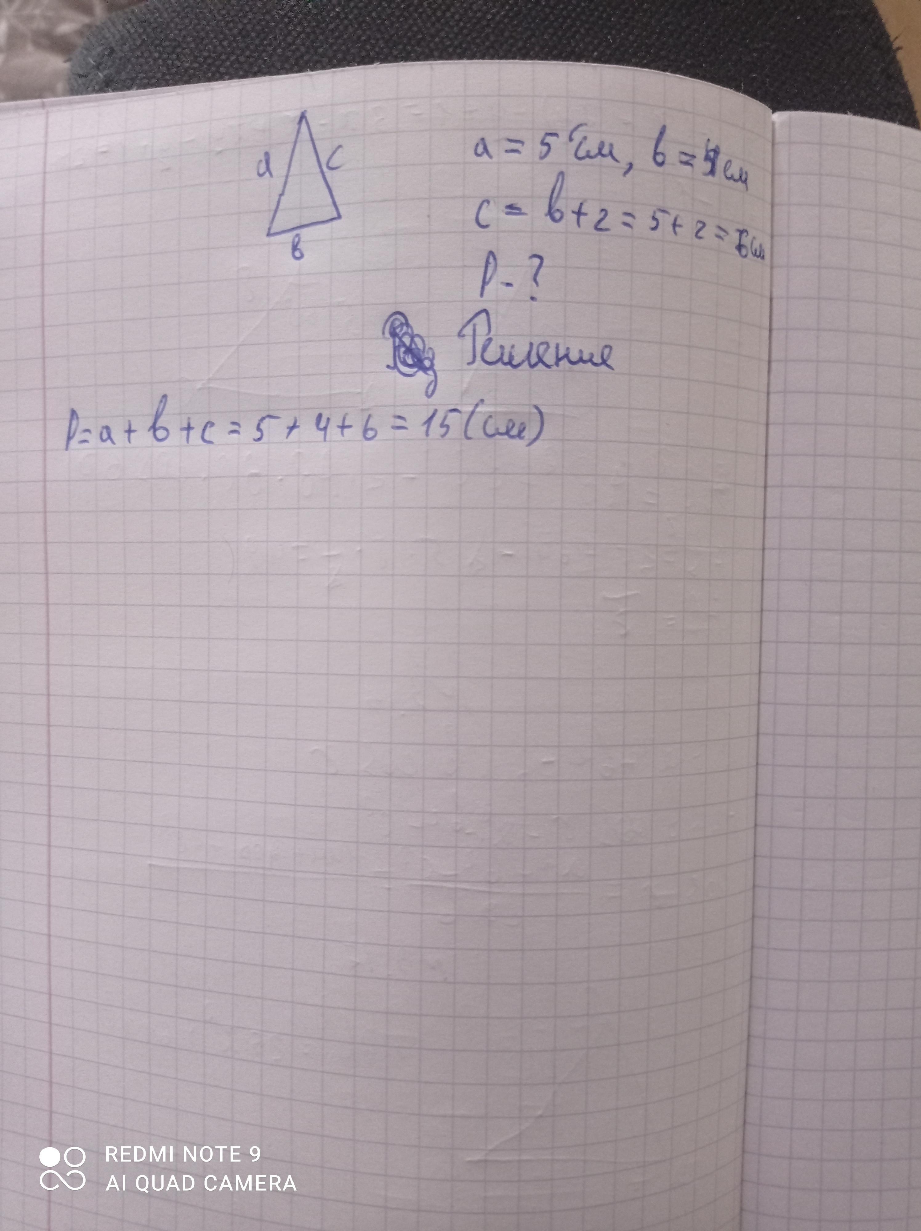 Найди периметр треугольника. Если одна его сторона равна 5 см, вторая-4см, а третья на 2 см больше второй стороны.
