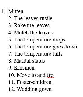 1. Рукавиця 2. Листя шелестить 3. Згрібає листя 4. Мульчує листя 5. Температура падає 6. Температура падає 7. Температура падає 8. Сімейний стан 9. Родичі 10. Переміщується туди-сюди 11. Виховувати - діти 12. Весільна сукня