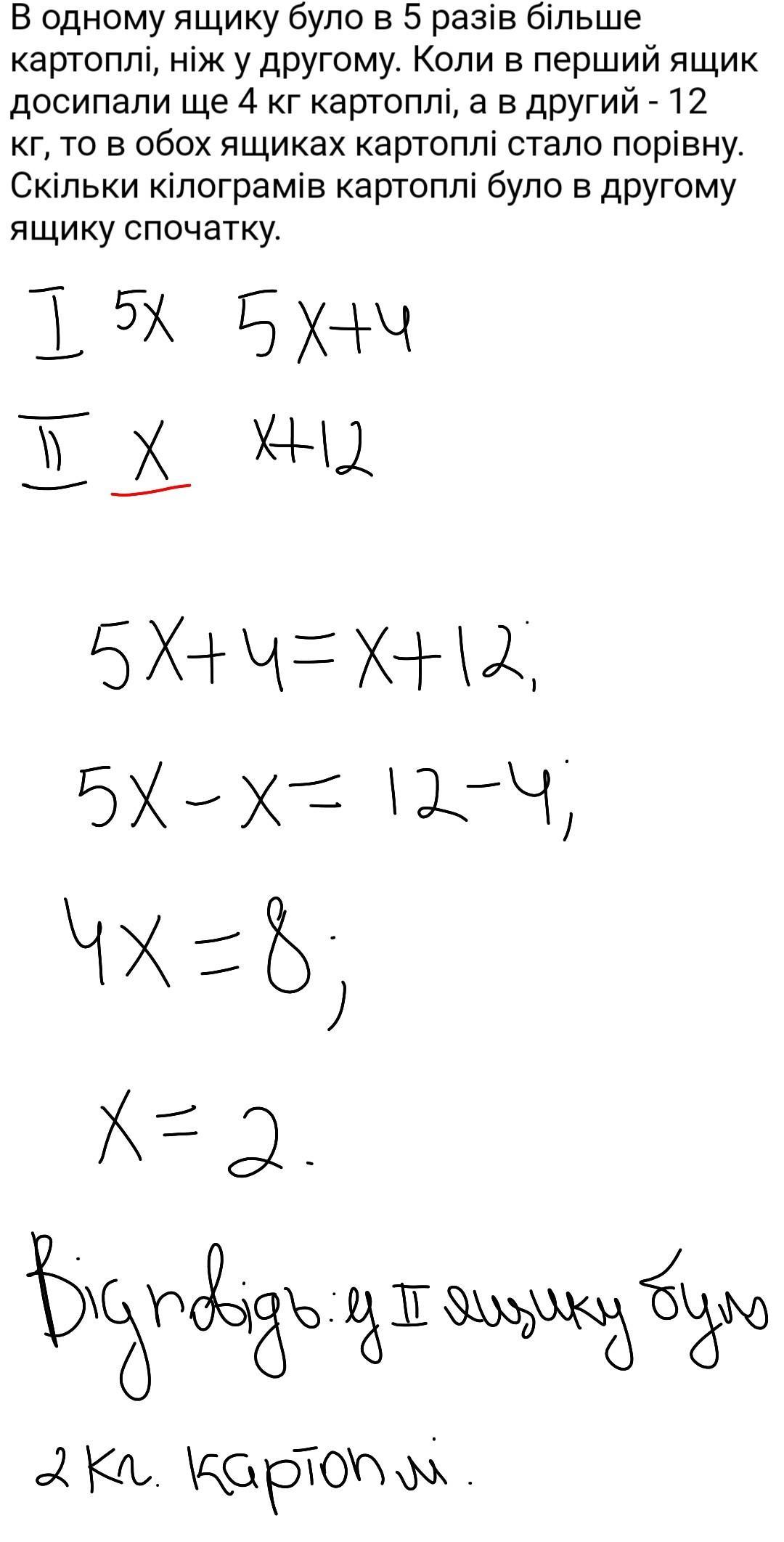 В одному ящику було в 5 разів більше картоплі, ніж у другому. Коли в перший ящик досипали ще 4 кг картоплі, а в другий - 12 кг, то в обох ящиках картоплі стало порівну. Скільки кілограмів картоплі було в другому ящику спочатку.