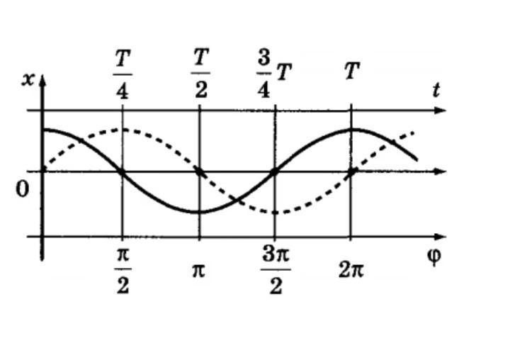 Отношение t/T показывает, какая часть периода прошла от момента начала колебаний. Любому значению времени, выраженному в долях периода, соответствует значение фазы, выраженной в радианах.