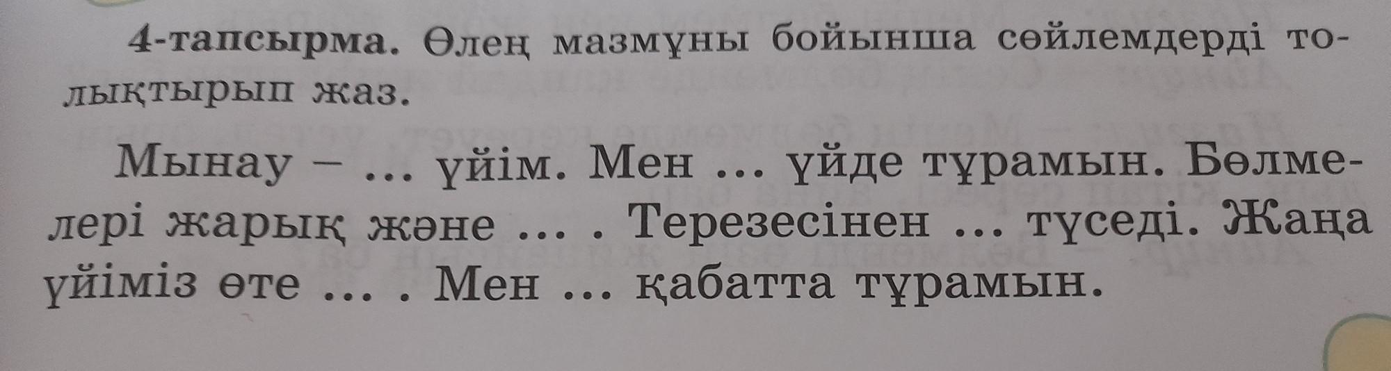 Мынау-менің үйім. Мен бұл үйде тұрамын. Бөлмелері жарық және әдемі. Терезесінен күн түседі. Жаңа үйіміз өте әдемі. Мен ? қабатта тұрамын