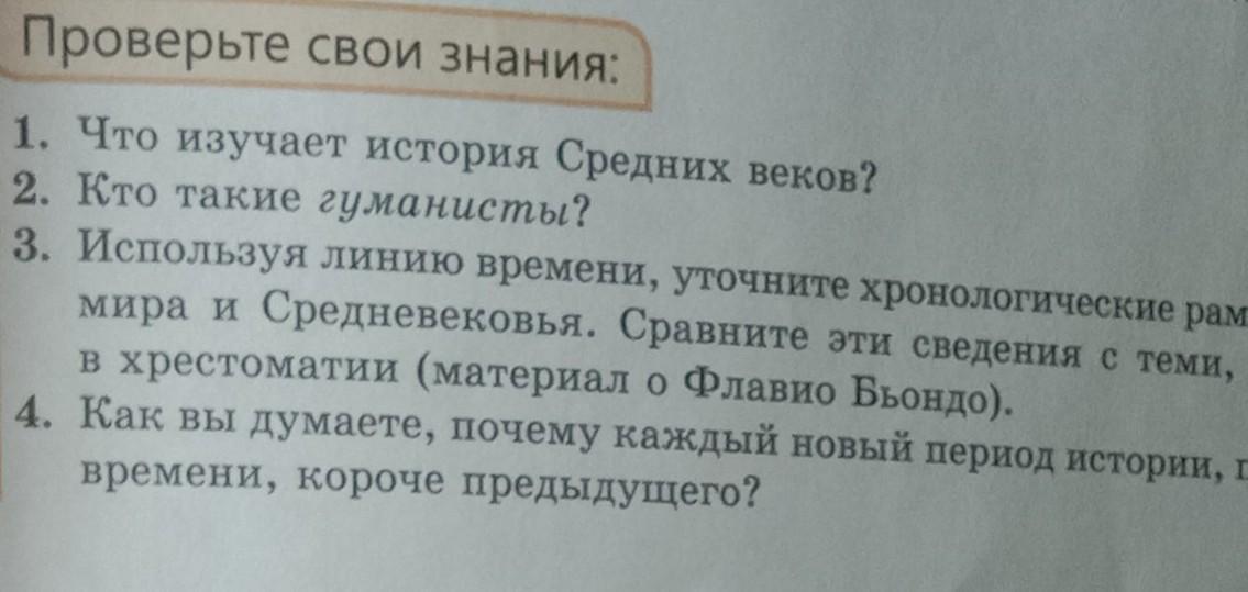 Проверьте свои знания: 1. Что изучает история Средних веков? 2. Кто такие гиманисты?ПОМОГИТЕ ДАМ 10 БАЛЛОВ