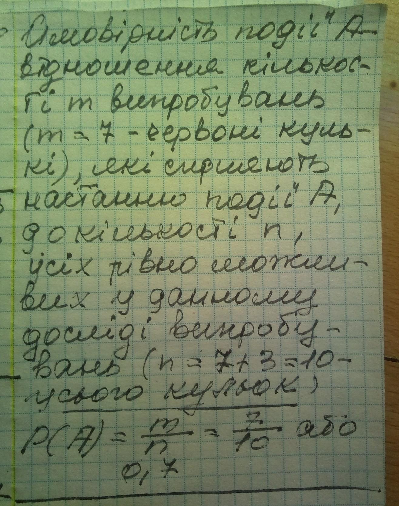 В ящику 7 червоних кульок і 3 зелених. Виймають навмання одну кульку.