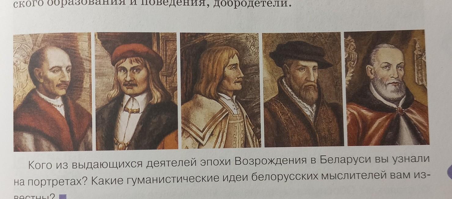Кого из выдающихся деятелей эпохи Возрождения в Беларуси вы узнали на портретах? Какие гуманистические идеи белорусских мыслителей вам из- вестны?